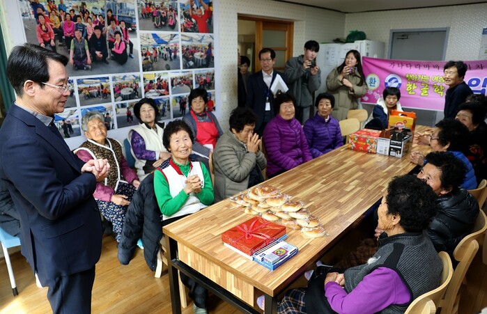 | ▲ 강진원 강진군수가 어머니 한글교실을 방문해 격려 인사말을 하고 있다. / 강진군 제공 |