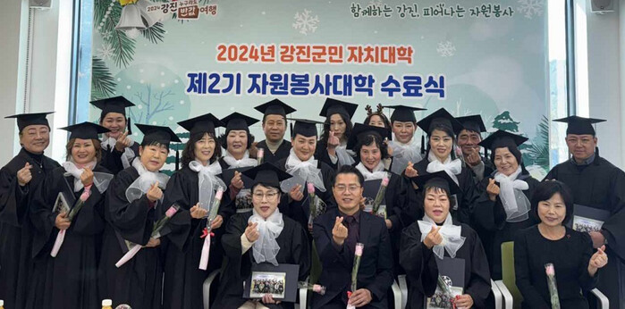 [강진=정찬남 기자] 전남 강진군이 지난 24일 크리스마스를 앞두고 강진군민 자치대학 제2기 자원봉사대학 수료식을 성황리에 개최했다. 이번 수료식은 강진군의 자원봉사 활성화와 자원봉사자 역량 강화를 목적으로 올 한 해 동안 총 14회차로 진행된 과정의 대미를 장식하는 자리였다.
