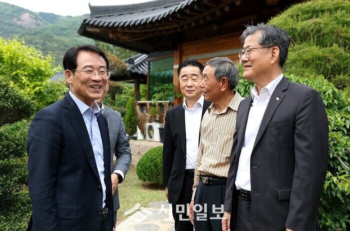 | ▲ 강진원 강진군수(왼 쪽 첫 번째)가 지난 14일 지방소멸대응 우수 사례인 강진 현장을 찾은 한국지방재정공제회 정선용 이사장이 의견을 교환하고 있다. / 강진군 제공 |