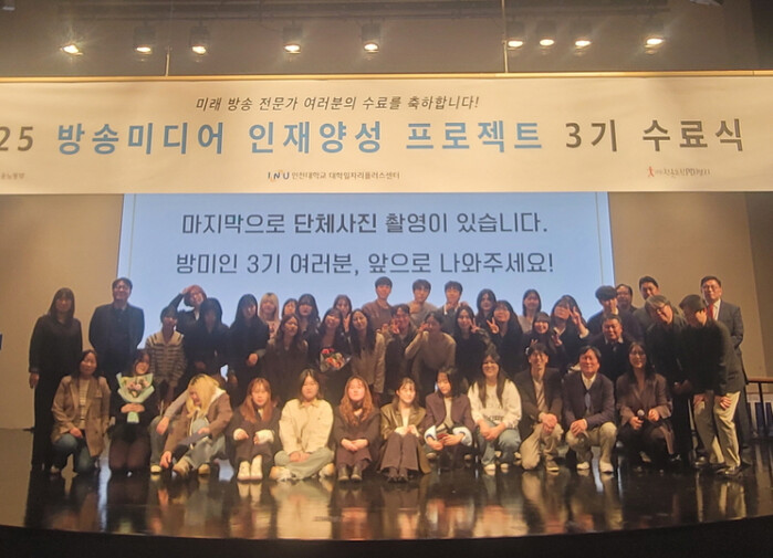 | ‘2025 방송미디어 인재 양성 프로젝트 3기 수료식’ 참가자들이 포즈를 취하고 있다. (사진=인천대) |
