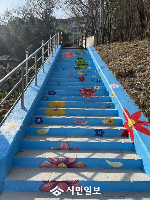 데크계단 입구에는 하늘색 바탕에 영암군 캐릭터인 남생이와 달토끼, 산이를 포함해 다양한 꽃을 그려 넣어 포토존 역할도 하도록 꾸몄다.