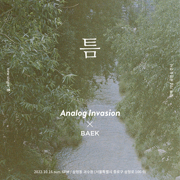 ‘Analog Invasion X BAEK’ 신곡 발매 기념 공연&전시는 10월 16일(일) 저녁 6시부터 서울 종로구 삼청동 ‘과수원’에서 개최되며, 예매방법은 구글폼을 통해 신청하면 된다.