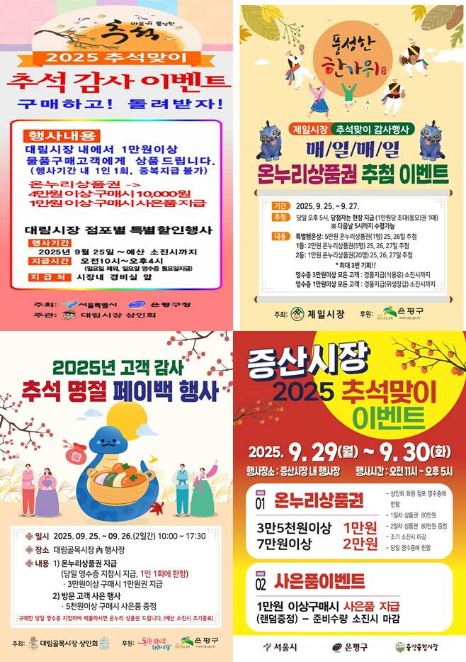 추석 명절 이벤트는 ▲대림시장, 제일시장 오는 25일부터 27일까지 ▲대림골목시장 오는 25일부터 26일까지 ▲증산종합시장 오는 29일부터 30일까지 진행된다.