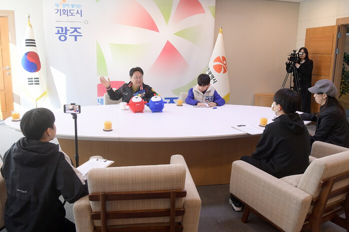 | ▲ 강기정 광주광역시장이 18일 오후 시청 접견실에서 치평초등학생의 진로체험교육 인터뷰에 응하고 있다. /광주광역시 제공 |