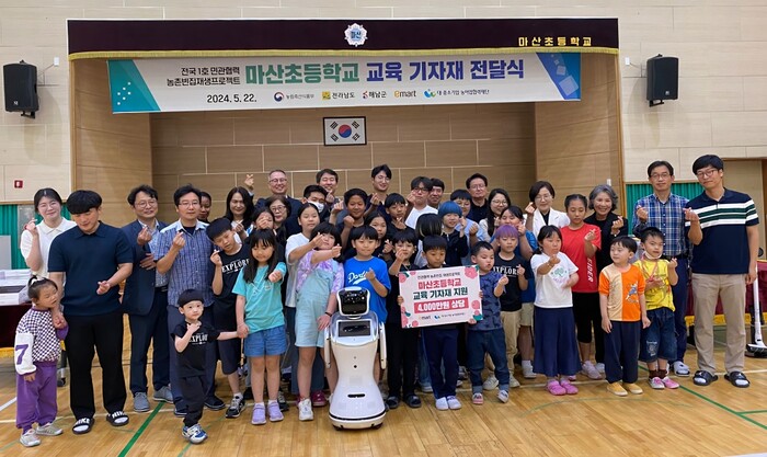 [해남=정찬남 기자] 전라남도해남교육지원청(교육장 이자영)은 지난 22일 대·중소기업·농어업협력재단, 이마트, 해남군, 마산초등학교 학생 및 교직원, 마산면 주민자치회, 해남교육지원청 관계자 등 60여 명이 참석한 가운데 전국 1호 작은학교 살리기 민관협력 농촌빈집재생프로젝트의 일환인 ‘마산초등학교 교육 기자재 전달식’ 행사를 가졌다.