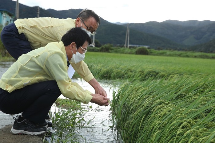 | ▲ 강진원 강진군수가 태풍(힌남노)과 폭우로 인해 물에 잠긴 농경지를 찾아 벼의 작황을 살피고 있다. / 강진군 제공 |