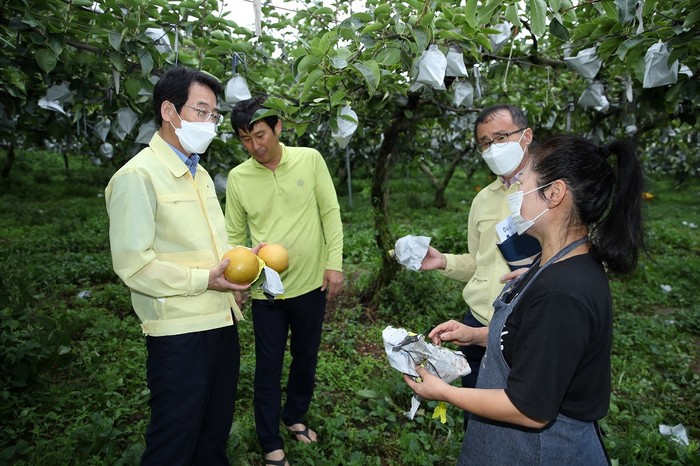 | ▲ 강진원 군수가 6일 태풍(힌남노) 피해 현장인 배 과수농가를 방문해 낙과 피해를 입은 농업인의 애로사항을 경청하고 있다. / 강진군 제공 |
