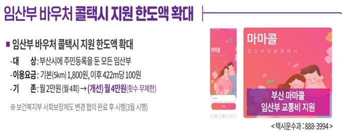 부산시(시장 박형준)는 오는 3월 1일부터 임산부 콜택시(이하 마마콜)의 지원 한도를 상향한다고 밝혔다.