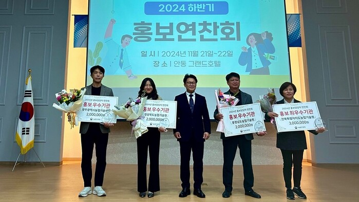 | ▲ 광주광역시농업기술센터, 지난 21일 경북 안동시 그랜드호텔에서 열린 농업진흥청 주관 ‘농촌진흥산업 홍보연찬회’에서 ‘2024년 농촌진흥기관 홍보 분야 평가’ 우수기관으로 선정, 기념촬영 / 광주광역시 제공 |