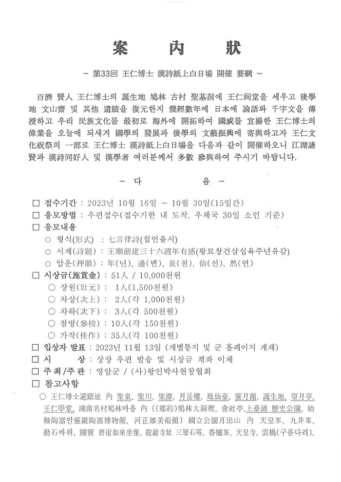 | ▲ 영암군, 제33회 왕인박사 한시지상백일장개최 요강 안내 이미지 / 영암군 제공 |