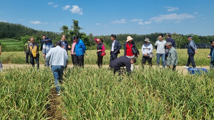 지난 13일, 고흥군에서 마늘을 재배하고 있는 농민들과 농협, 고흥군농업기술센터 관계자를 포함, 40여명이 강진군 마늘 재배기술을 배우기 위해 신전면 마늘밭을 찾아 현지 농민의 설명과 현장을 둘러보는 시간을 가졌다.