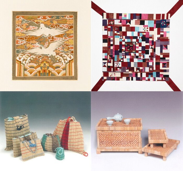 | ▲ 2025년 화성특례시 공예명장 공예품(윗줄 김애경 대표의 쌍학흉배·혼례용보자기 작품, 아랫줄 김은자 대표의 초경공예 손가방·다기함 작품) /사진제공=화성특례시 |