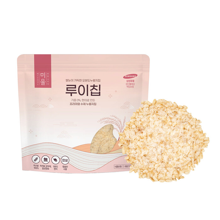 회사에 따르면 미율(味聿)은 우리 고유의 곡물 간식을 다루는 브랜드다. 미율 루이칩은 한국의 오랜 간식인 누룽지를 스낵으로 재해석하여 남녀노소 누구나 건강 간식으로 즐기기 좋다.