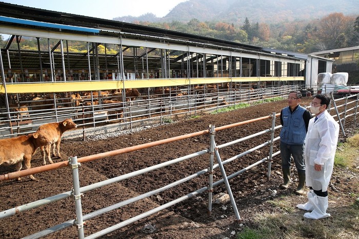 | ▲ 강진원 군수가 지난 16일 강진읍 녹색목장을 방문해 노민섭 대표와 후보씨 숫소에 선정된 한우를 살펴 보고 있다. / 사진=강진군 제공 |