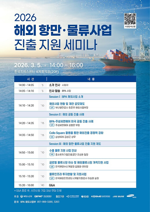 참가 신청은 포스터 내 QR코드 및 부산항만공사 누리집 을 통해 가능하며, 자세한 사항은 부산항만공사 해외사업부 로 문의하면 된다.