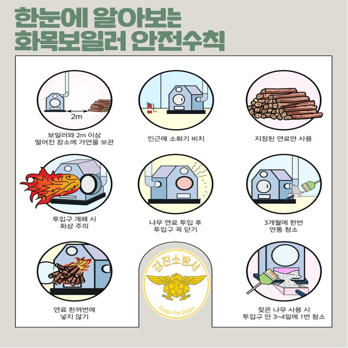 강진소방서가 당부하는 화목보일러 안전수칙은 ‘보일러 주변 2m 이상 떨어진 장소에 가연물 보관’, ‘근처에 소화기 비치’, ‘나무연료 투입 후 투입구 꼭 닫기’, ‘청소 전 남은 불씨 확인’, ‘3개월에 한번 연통 청소하기’ 등이다.