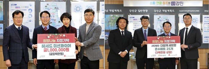 | ▲ 강진원 강진군수가 지난 12일 군수실에서 열린 희망2025나눔캠페인에 동참한 헤세드 미션콰이어와, 비영리법인 ‘더함께 새희망’ 으로부터 기탁금을 전달받고 관계자 등과 기념촬영을 하고 있다. / 강진군 제공 |