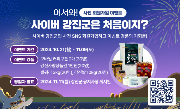 이번 사전 회원가입은 강진군청 홈페이지에서 네이버와 카카오의 SNS 간편 로그인 방식을 활용해 누구나 쉽게 참여 가능하다. 특히, 참여자 중 추첨을 통해 모바일 커피 쿠폰과 강진에서 생산된 쌀, 귀리 등의 특별한 지역 농산물이 경품으로 증정되어 강진군의 지역 특산물을 알리는 동시에 참여자들에게 풍부한 혜택을 제공한다.
