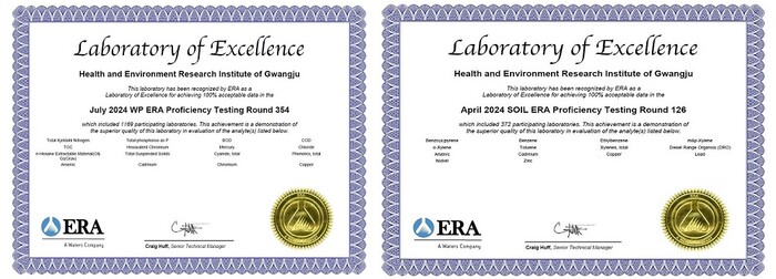 | ▲ 광주광역시, 미국환경자원협회(ERA)의 수질 및 토양분야 국제 ‘최우수 분석기관’ 국제인증서 이미지 / 광주광역시 제공 |