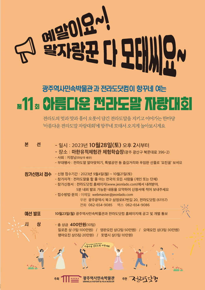 최경화 역사민속박물관장은 “전라도말 자랑대회에 많은 관심과 참여를 부탁드린다”며 “우리의 삶 속에 녹아있는 전라도말을 다시 꺼내보는 기회가 되길 바란다.”고 말했다.