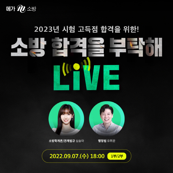강연자는 소방학개론/소방관계법규 심승아, 행정법 유휘운 강사를 비롯해 소방 체력시험 전문가가 직접 등장해 라이브 방송에 참여한다.