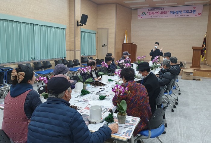 지난 6일부터 11개 읍면 복지회관을 찾아가 65세 이상 어르신 300여 명을 대상으로 실시하고 있는 이 프로그램에는 우울증 척도검사, 우울증 예방 교육, 원예치료 활동 지원을 통해 심신의 안정과 재활을 돕고 있다.