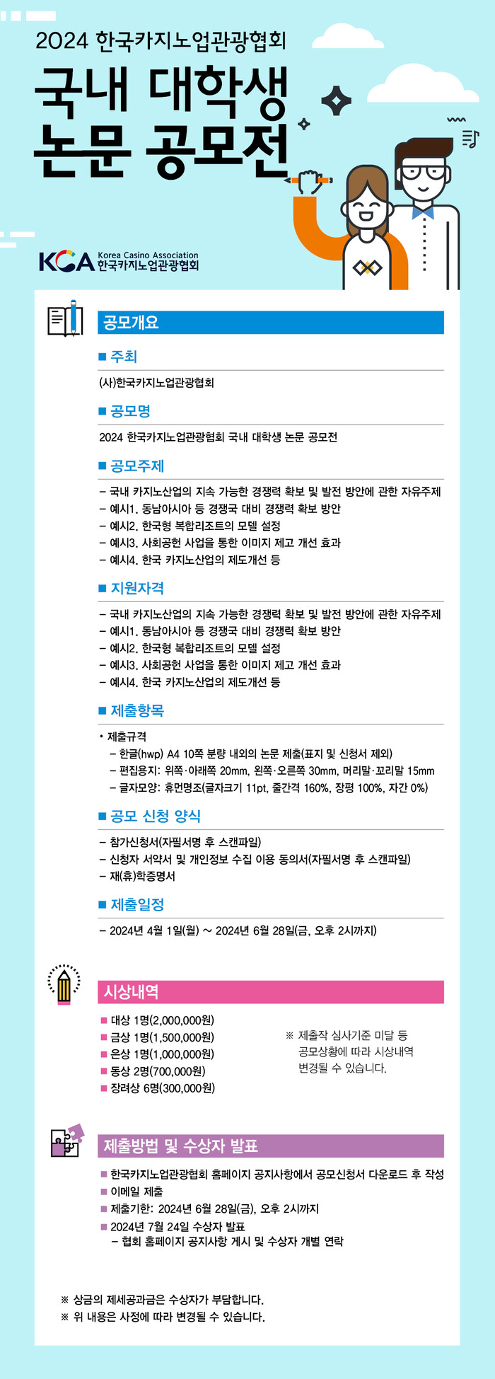 한국카지노업관광협회는 카지노산업에 관심이 많은 국내 대학생을 대상으로 “2024 한국카지노업관광협회 국내 대학생 논문 공모전”을 개최한다고 밝혔다.