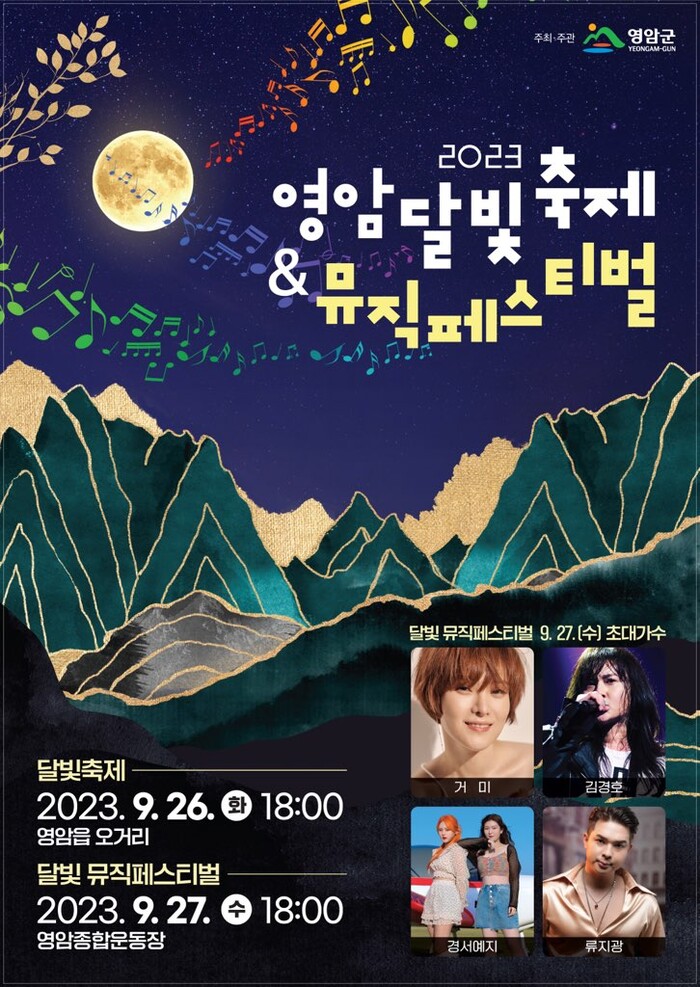 축하콘서트는 세대를 아우르는 뮤지션 거미, 경서예지, 김경호, 류지광이 초청돼 추석을 앞둔 관광객과 영암군민, 귀성객에게 감동과 즐거움을 선사할 예정이다.