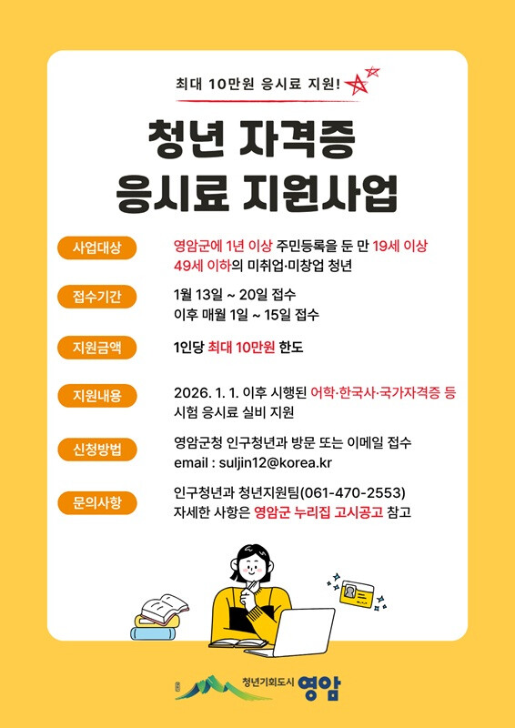 | ▲ 청년 자격증 응시료 지원사업 안내 이미지 / 영암군 제공 |