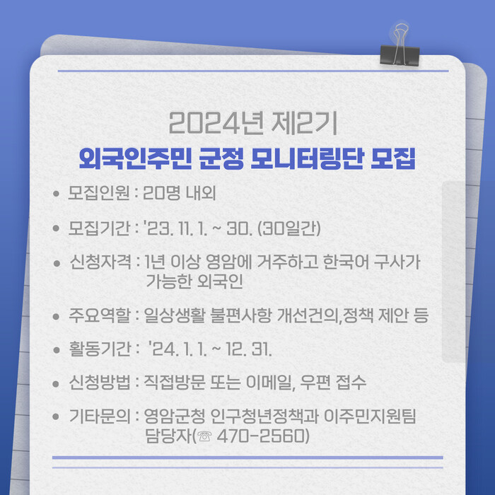 | ▲ 영암군, 2024년 제2기 외국인주민 군정 모니터링단 모집 안내 이미지 / 영암군 제공 |