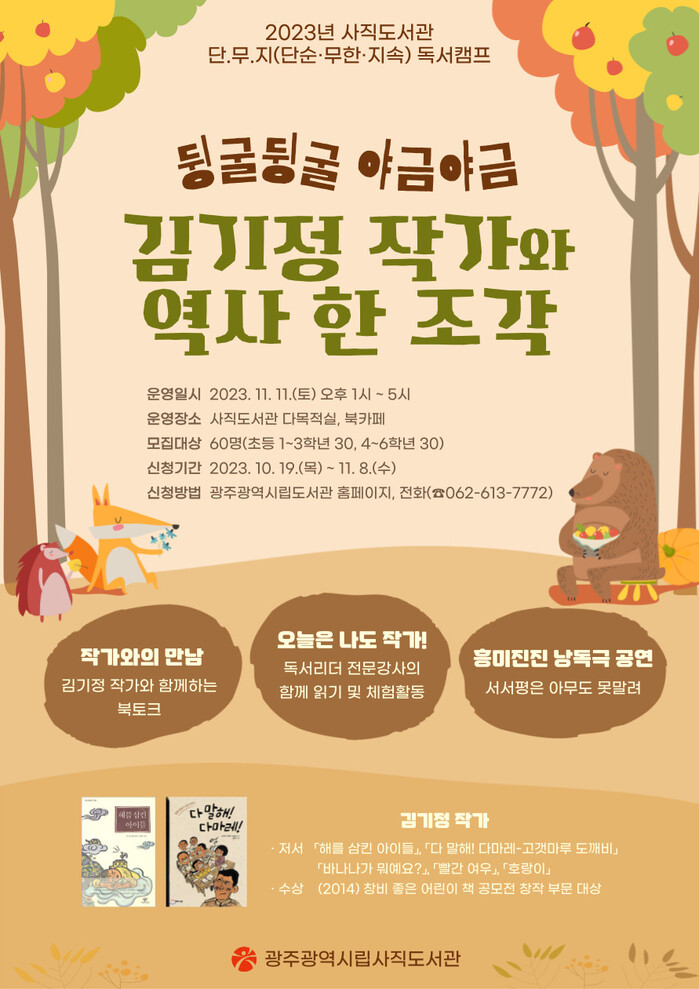 이날 행사는 김기정 작가의 작품 ‘고갯마루 도깨비’, ‘해를 삼킨 아이들’을 함께 읽고 저자와 북토크, 독서 체험활동, 낭독극 관람 등 다채롭게 진행된다.