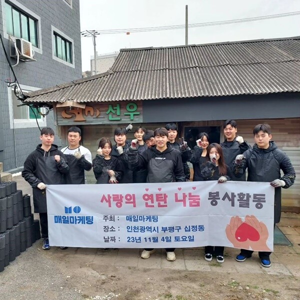 매일마케팅의 이번 ‘사랑의 연탄나눔 봉사’는 인천 부평구에서 진행되었으며, 총 1,500장의 연탄을 기부하였다. 임직원 전원이 참가한 이번 연탄봉사를 통해 매일마케팅 측은 지속적인 나눔봉사를 이어가 사회적 책임에도 적극 나서겠다고 밝혔다.