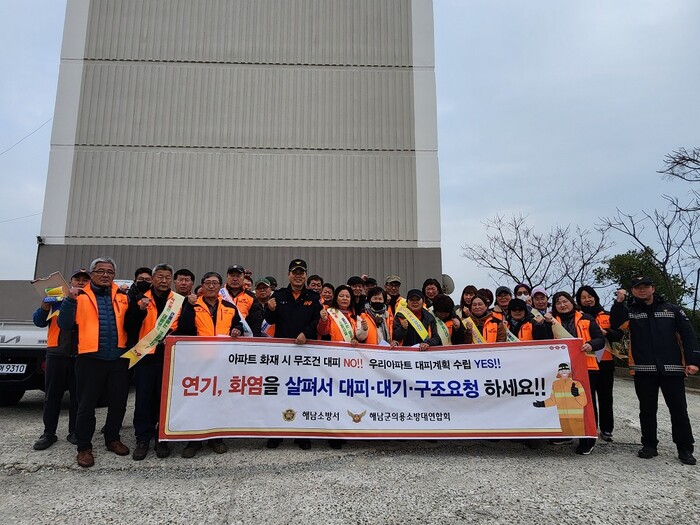 [해남=정찬남 기자] 전남 해남소방서(서장 최진석)는 지난 30일 해남군 송지면 소재 금영아파트(송지면 산정리 금영아파트)에서 소방공무원 및 송지면 남ㆍ여의용소방대원 50여 명이 참여한 가운데 아파트 화재예방 및 피난행동요령 캠페인을 실시했다.