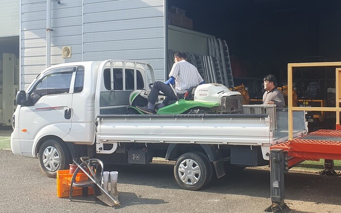 | ▲ 강진군 소재 한 농업인이 강진군농업기술센터 임대농기계 사업소에서 농기계를 임대해 화물차량에 승차하고 있다. / 강진군 제공 |