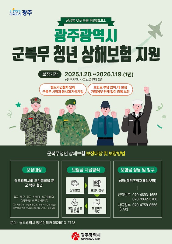 권윤숙 청년정책과장은 “군복무 청년 상해보험은 광주청년들의 안전한 군 생활을 지원하기 위한 것”이라며 “앞으로도 청년복지를 위한 다양한 청년지원정책 발굴에 힘쓰겠다”고 말했다.