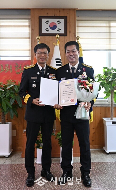 | ▲ 2025년 상반기 모범공무원 선발 대상자에 선정된 해남소방서 박현익 소방경(오른 쪽)이 박춘천 해남소방서장으로부터 정부포상인 국무총리 표창을 대신 전수받고 기념촬영을 하고 있다. / 해남소방서 제공 |