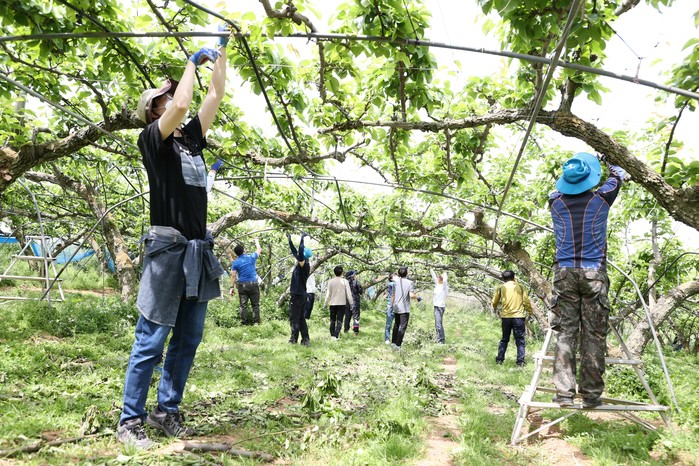 직원들은 코로나19 장기화에 따른 근로자 수급 문제, 농촌의 인구 문제 때문에 노동력 부족에 힘들어하는 농가를 위해 서툴지만, 정성을 담아 10일에 대규모 배 과수원에서 배 열매솎기 작업을 하며 농민들을 위해 힘썼다.