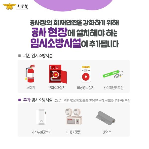 임시소방시설은 기존 소화기, 간이소화장치, 비상경보장치, 간이피난유도선 4종에서 가스누설경보기, 비상조명등, 방화포 3종의 소방시설이 추가된다.