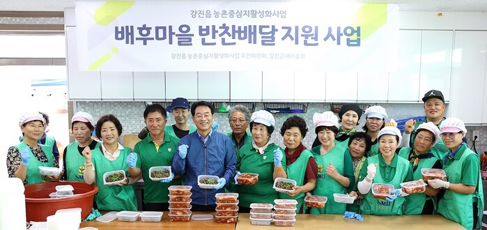 | ▲ 강진원 군수(왼 쪽부터 다섯 번째)가 강진읍 농촌중심지활성화를 위해 추진하고 있는 배후마을 반찬배달 지원사업에 참여한 강진군새마을회원들과 조리한 반찬을 들어 보이며 기념촬영을 하고 있다. / 강진군 제공 |
