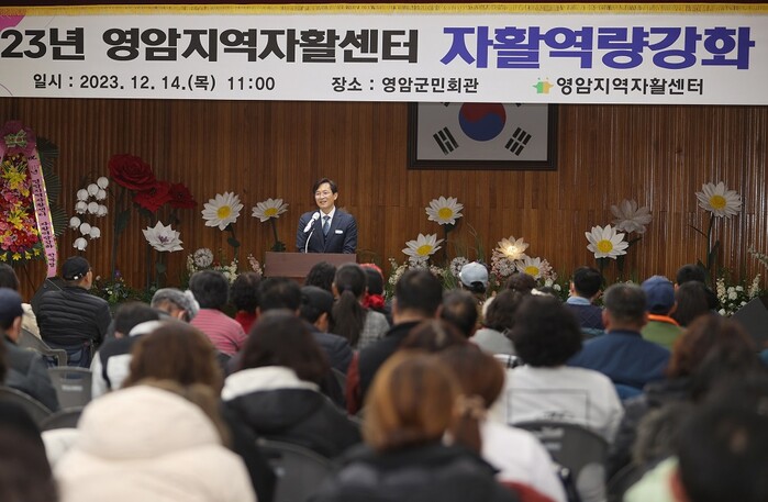| ▲ 우승희 영암군수가 지난 14일 군민회관에서 열린 ‘2023년 자활역량 강화 한마당 행사’에 참석해 올 한 해 힘 써 주신 자활 참여자 및 종사자에 대한 격려 인사말을 하고 있다. / 영암군 제공 |