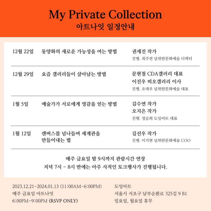 이번 전시는 서초구 도잉아트에서 열리며, 전시 기간동안 매주 금요일 저녁 작가들의 이야기를 들을 수 있는 아주 사적인 토크 행사 ‘아트나잇’이 열릴 예정이다.