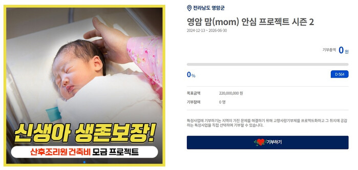 모금에 앞서 영암군은 지난해 ‘영암 맘(mom) 안심프로젝트 시즌1’로 공공산후조리원 의료장비 구입비 2억2,000만 원 모금을 성황 속에 완료했다.