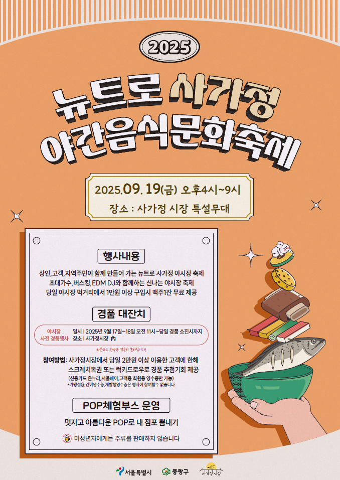 다가오는 19일 목요일 저녁, 사가정시장에서 펼쳐질 ‘뉴트로 야간음식문화축제’는 전통과 현대가 어우러진 잊지 못할 하루로, 시민들에게 새로운 즐거움과 따뜻한 추억을 선사할 것이다.