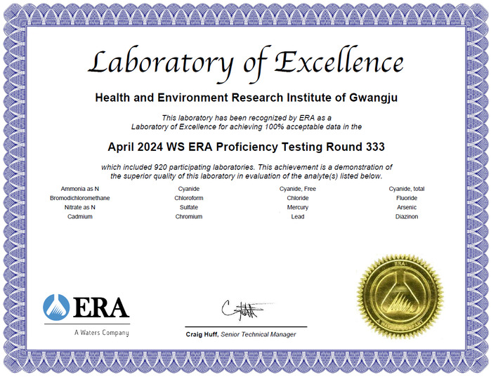 숙련도 시험은 먹는물 분야 시험·검사기관의 분석능력 검증 및 검사결과의 정확성‧신뢰성 확보를 위해 실시하는 것으로, 광주보건환경연구원은 국제숙련도 시험평가기관 중 한 곳인 미국 환경자원학회(ERA)에서 실시하는 시험에 참가했다.