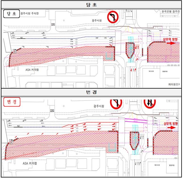 | ▲ 광주도시철도건설본부, 한국은행 사거리 앞 도로 가시설 설치 작업 차로 추가 점용 위치도 / 광주광역시 제공 |