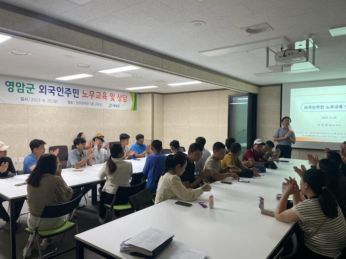 [영암=정찬남 기자] 전남 영암군(군수 우승희)이 지난 20일 영암군외국인주민지원센터와 외국인 밀집거주지역인 삼호읍 한마음회관에서 ‘찾아가는 외국인주민 노무교육 및 상담’을 실시했다.