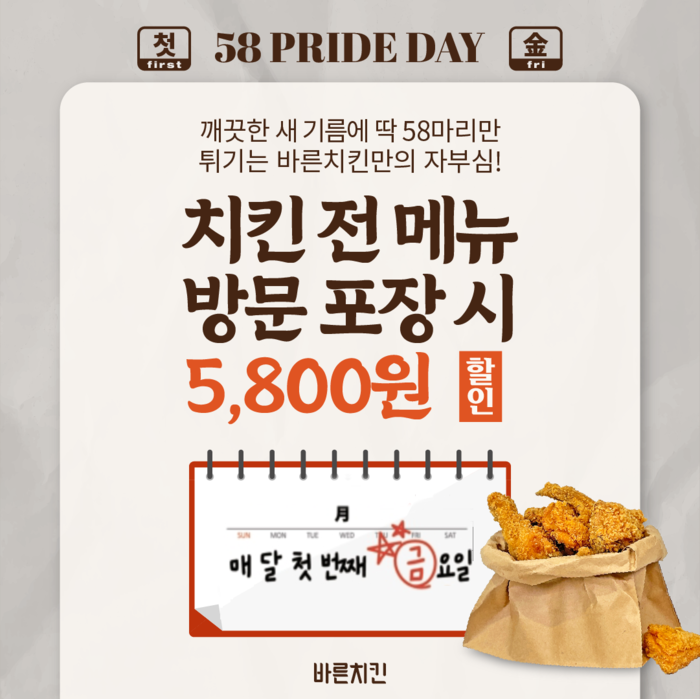 바른치킨은 매월 첫번째 금요일을 ‘바른데이’로 지정해 전메뉴를 5,800원 할인하는 이벤트를 정기적으로 진행하고 있다. 특정 메뉴에 한정하지 않고 전 메뉴에 할인을 적용할 수 있어 고객들은 원하는 메뉴를 선택할 수 있다.