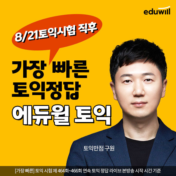 시험 종료 5분 후 시작하는 초스피드 토익 정답 라이브 방송에서는 에듀윌 토익 구원 강사가 시험 총평과 해설을 진행한다.