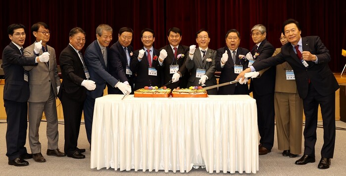| ▲ 재광강진군향우회 창립 총회 축하 케잌 커팅식이 열리고 있다. 왼쪽부터 조형곤 사무총장, 김대원 부회장, 박병준 고향사랑위원장, 김홍연 부회장, 유태명 고문, 강진원 강진군수, 차용훈 회장, 김경만 국회의원, 박영수 재부산회장, 차용수 재경회장, 김보미 군의장, 장인균 부회장 순. / 강진군 제공 |