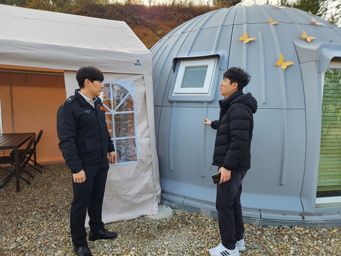 | ▲ 해남소방서 소방관계자가 지난 11일 겨울철 휴양시설에서 발생할 수 있는 화재 및 안전사고 예방을 위해 관내 현장 안전관리 강화 지도 점검을 하고 있다. / 해남군소방서 제공 |